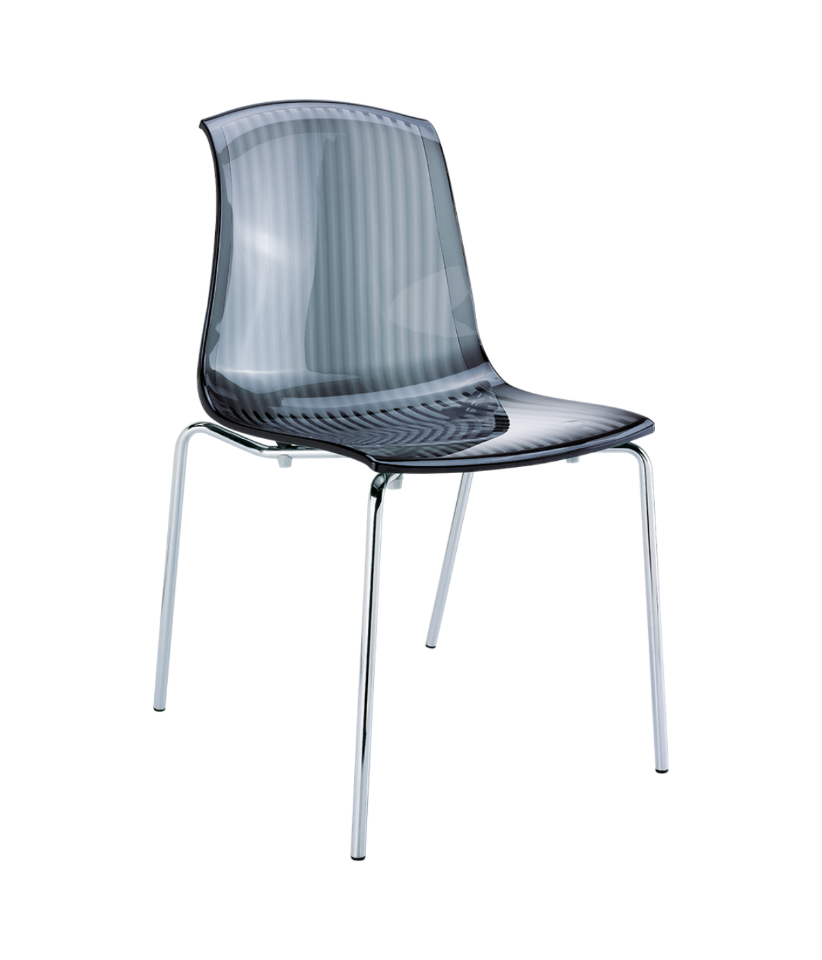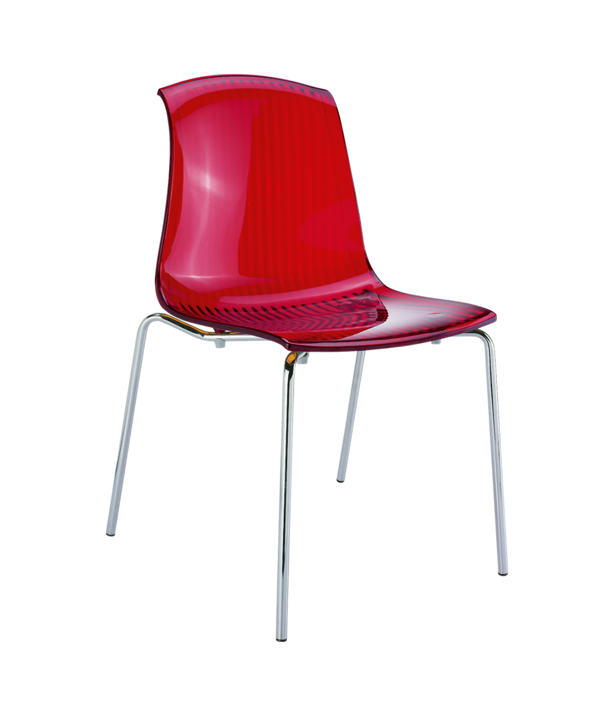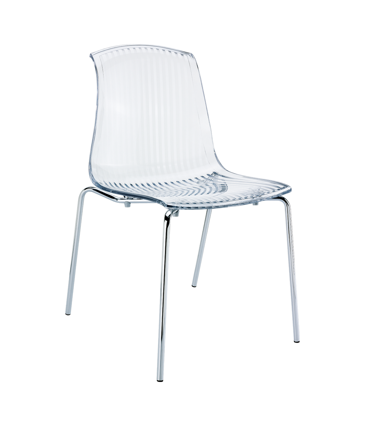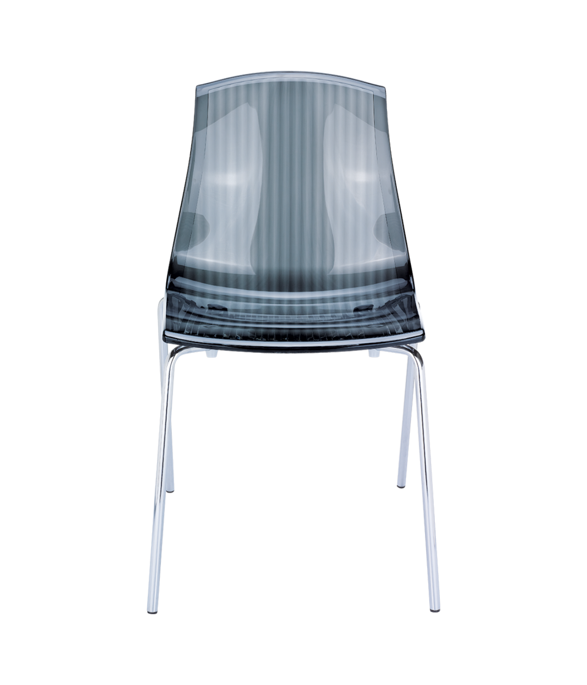 Recyclable polycarbonate main body. Legs frame in tubular chrome steel. Stackable. For indoor use.