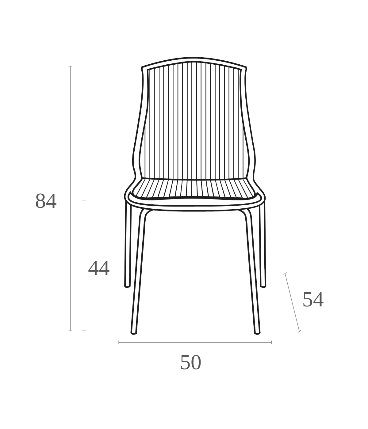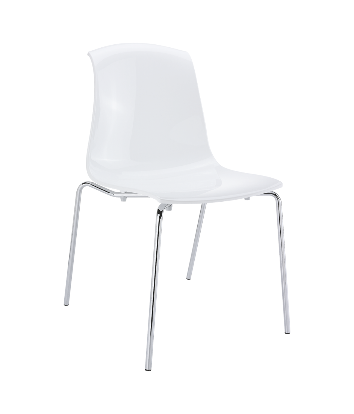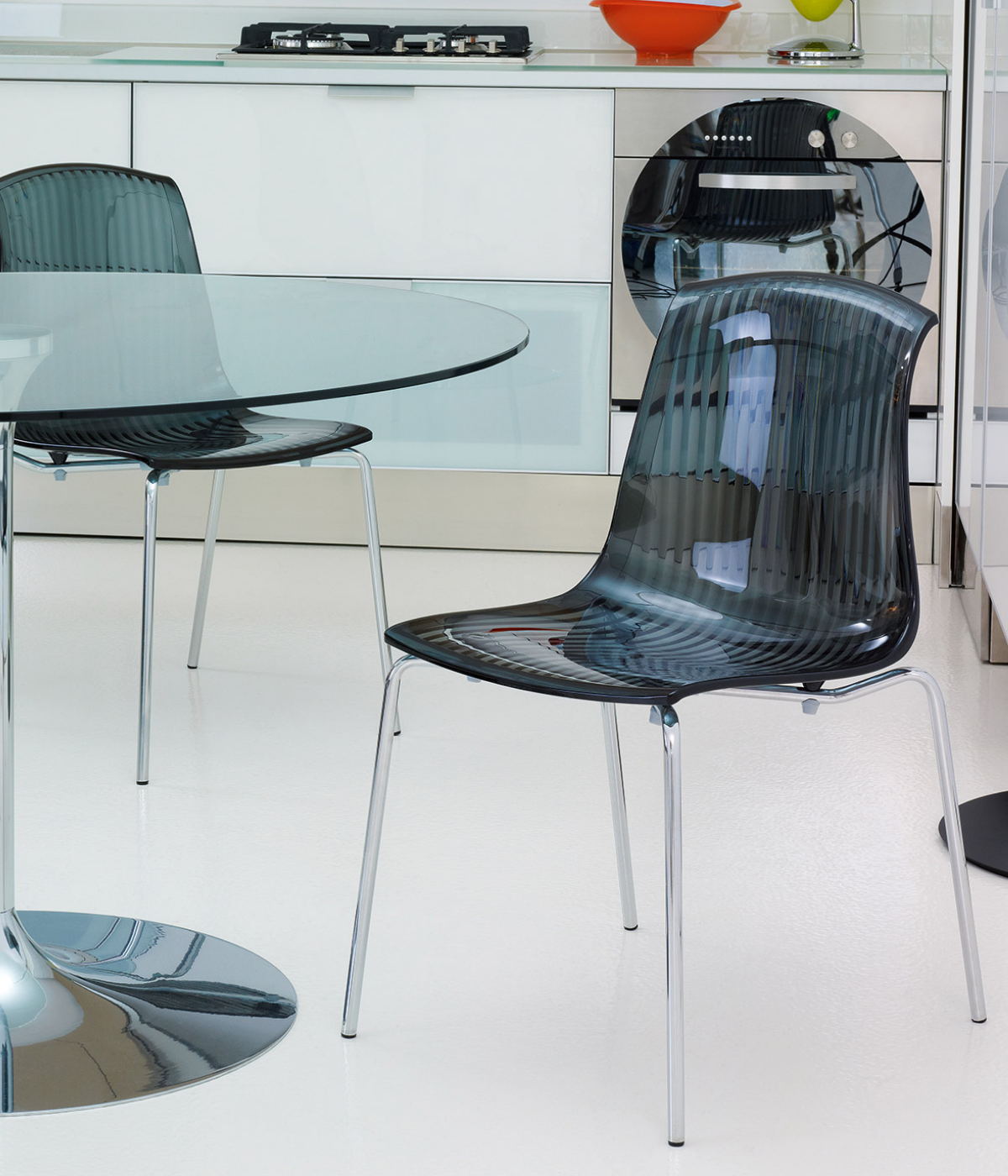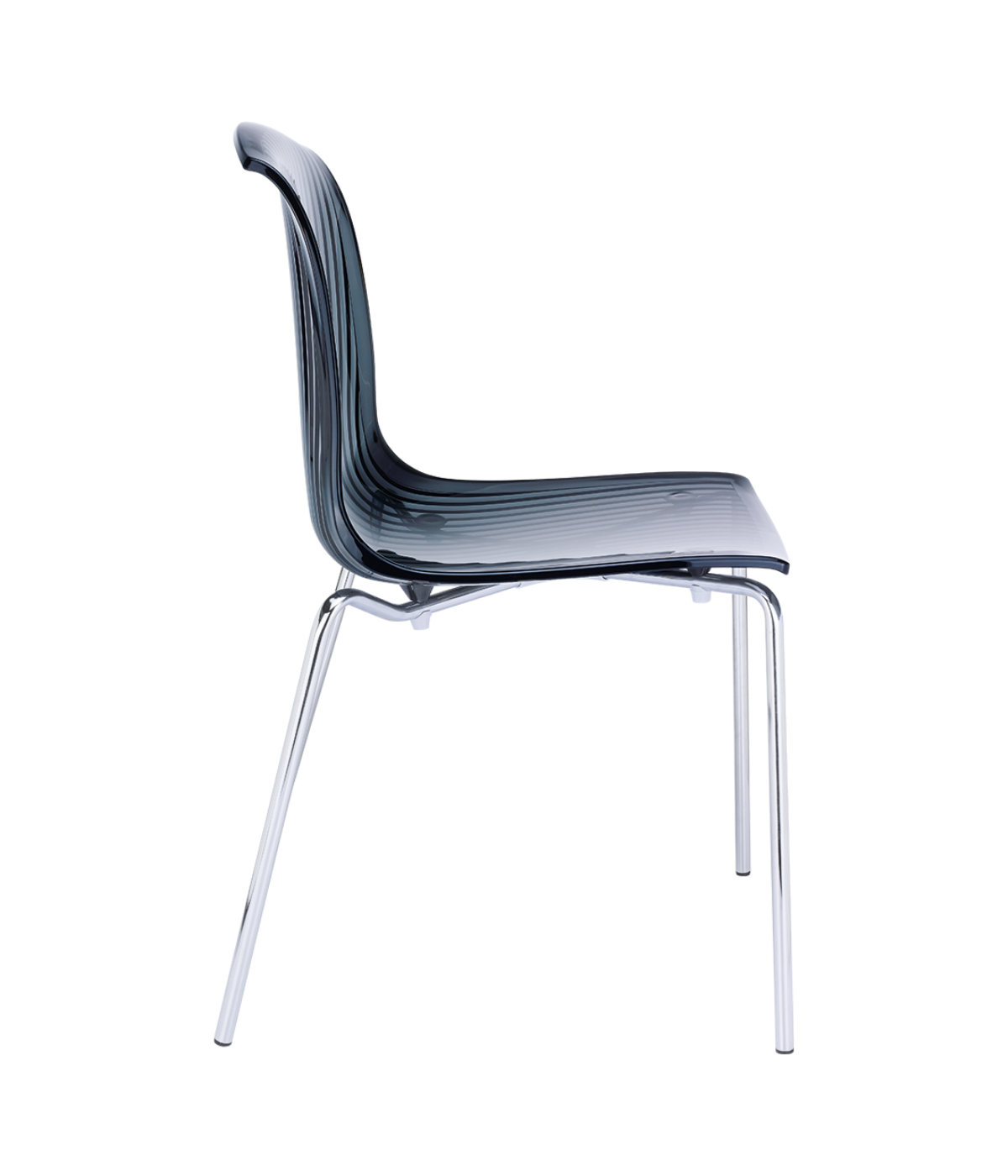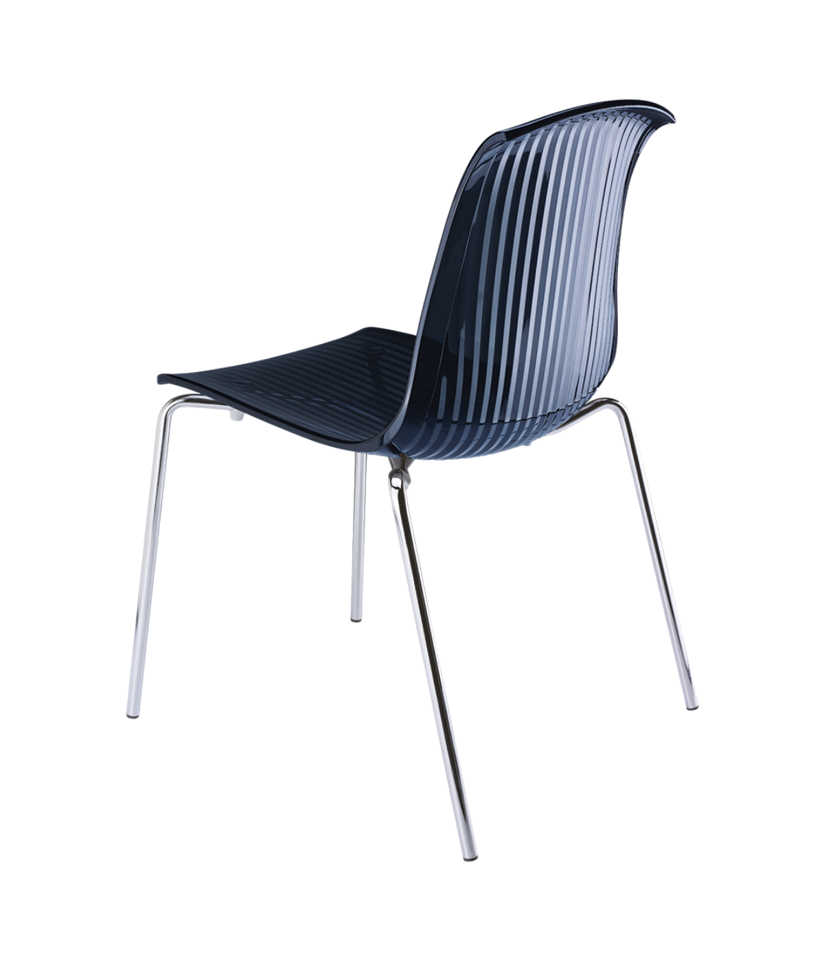 Recyclable polycarbonate main body. Legs frame in tubular chrome steel. Stackable. For indoor use.