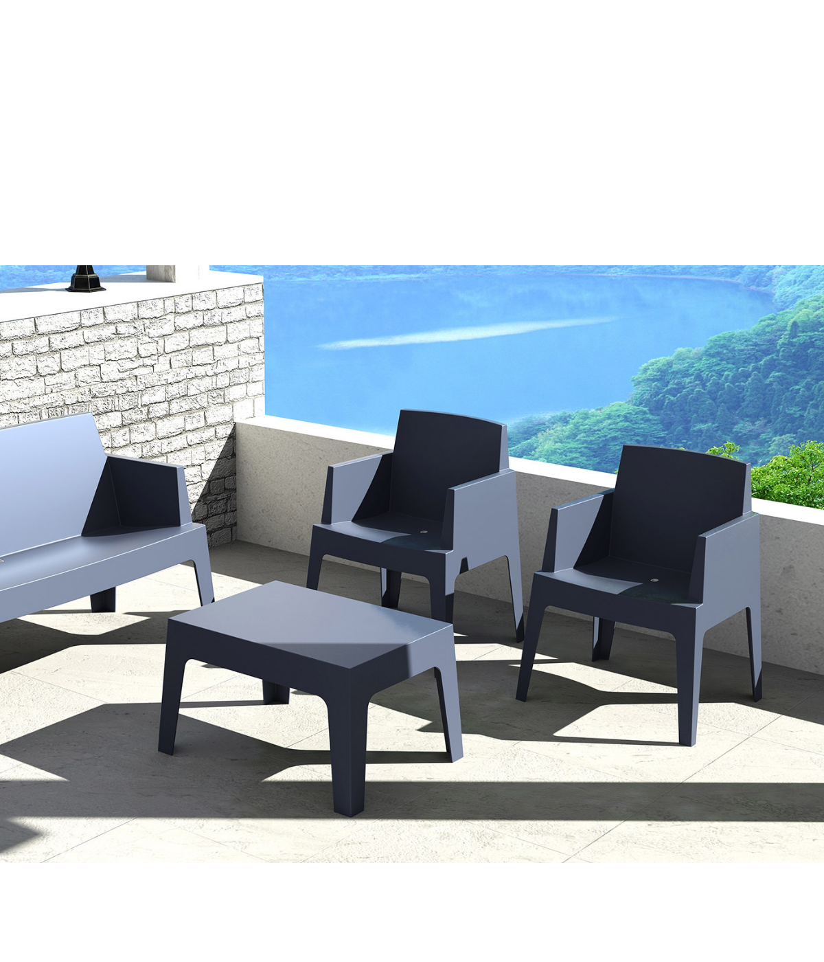 Stacking table in recyclable polypropylene, for indoor and outdoor use.