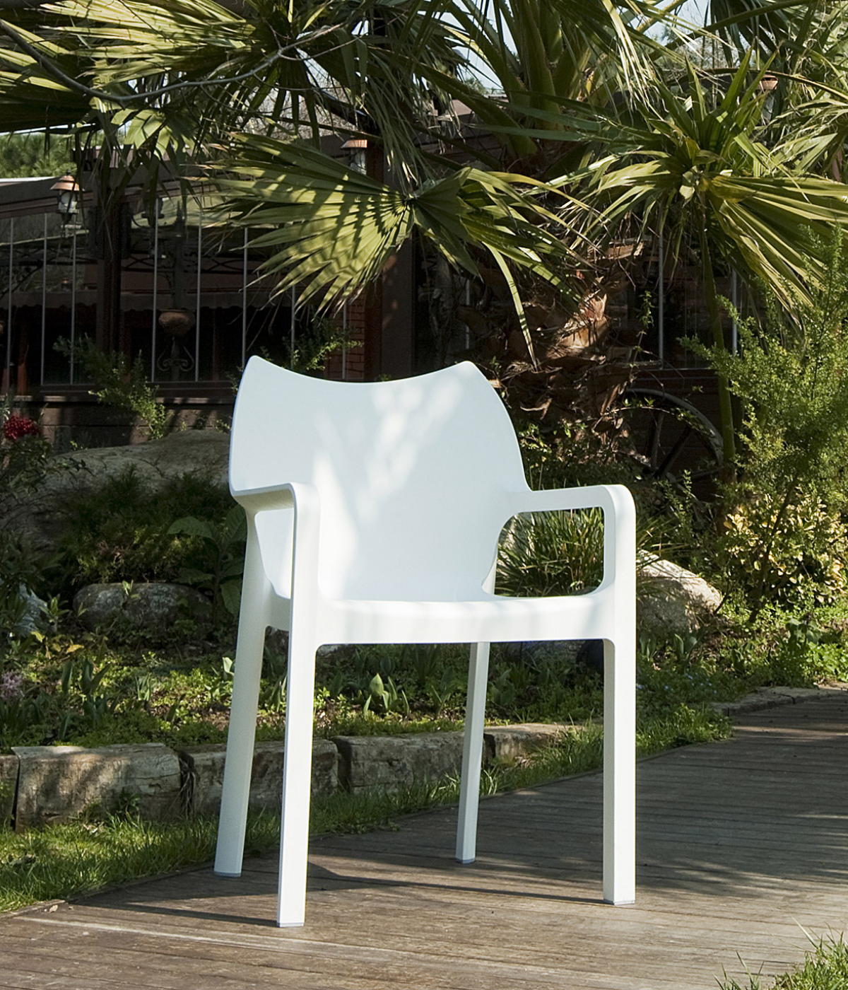 Diva armchair is produced with a single injection of polypropylene reinforced with glass fiber obtained by means of the latest generation of air moulding technology with neutral tones. For indoor and outdoor use.