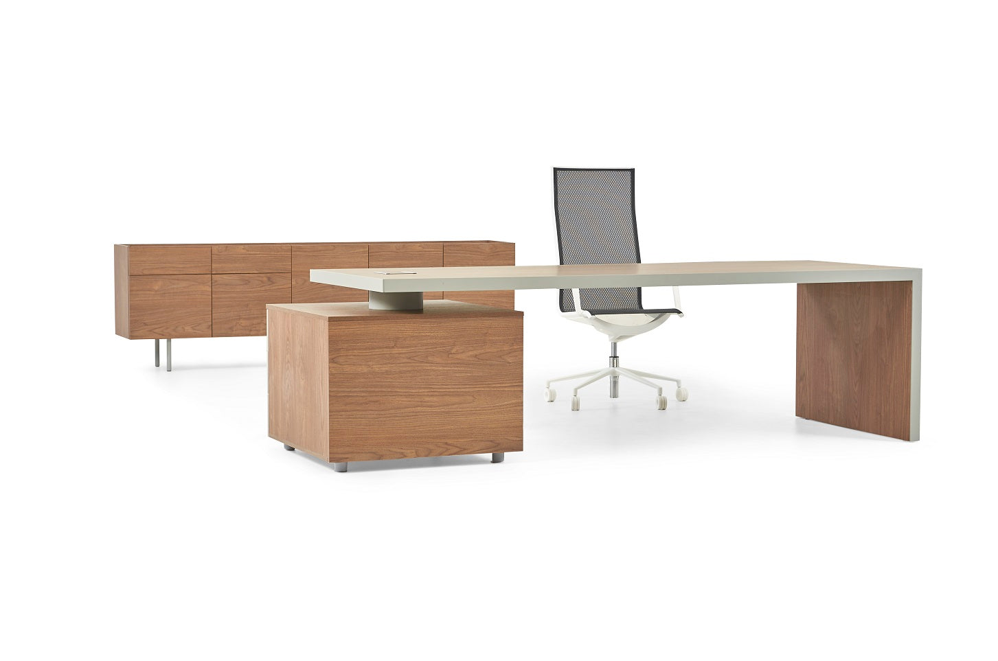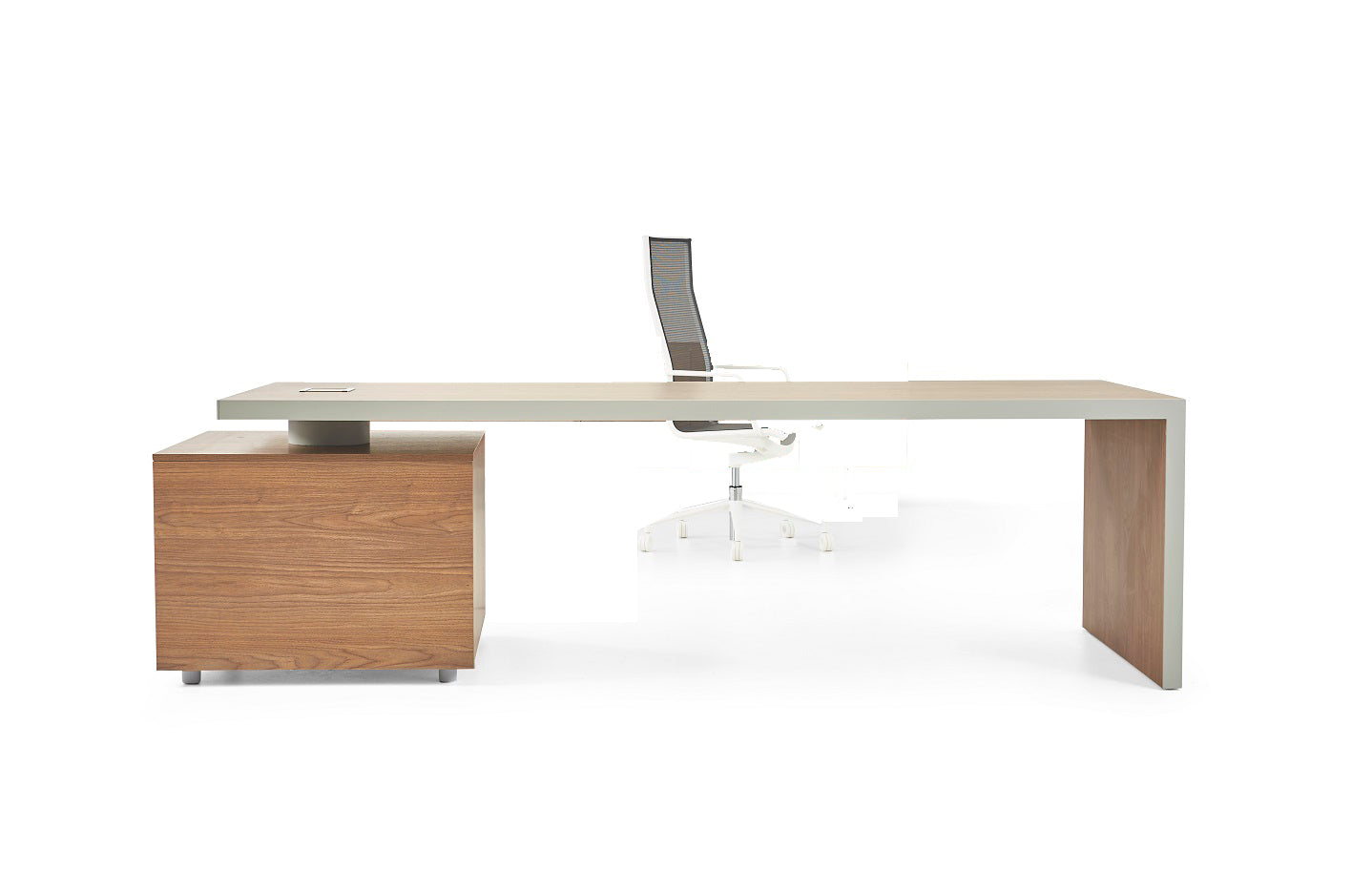 Forma Desk stands out for lightness and high-tech as it shows out its aluminum material along with wooden veneer adding that warm sense of comfort.