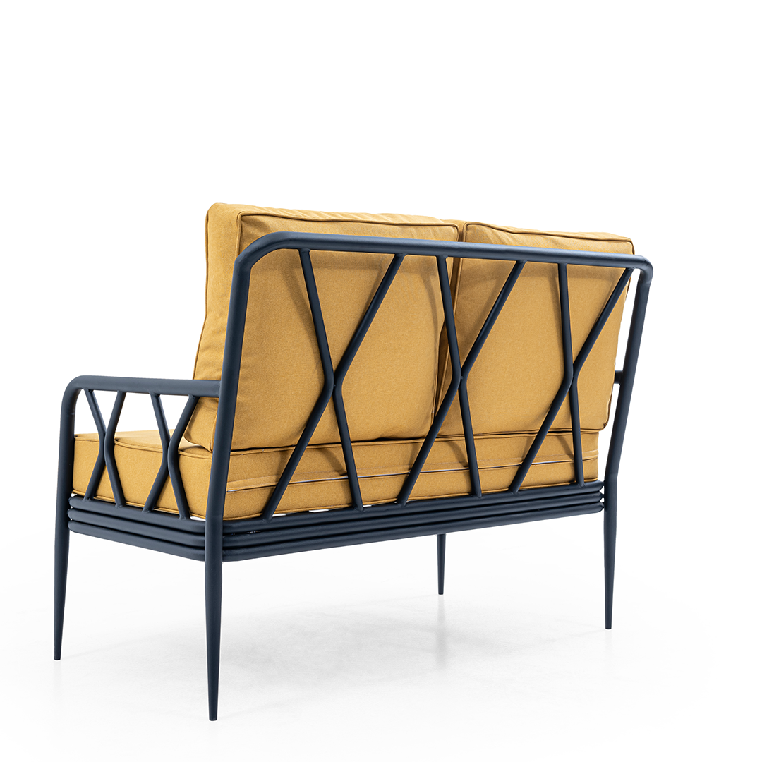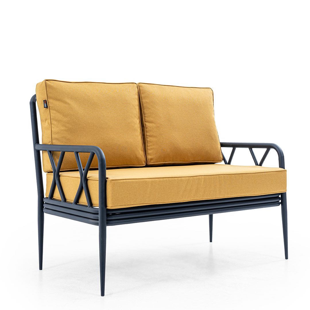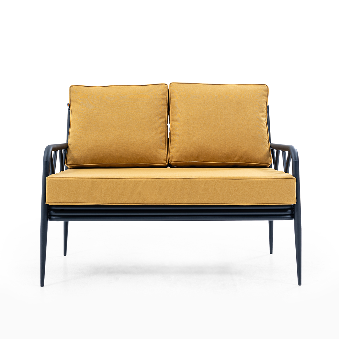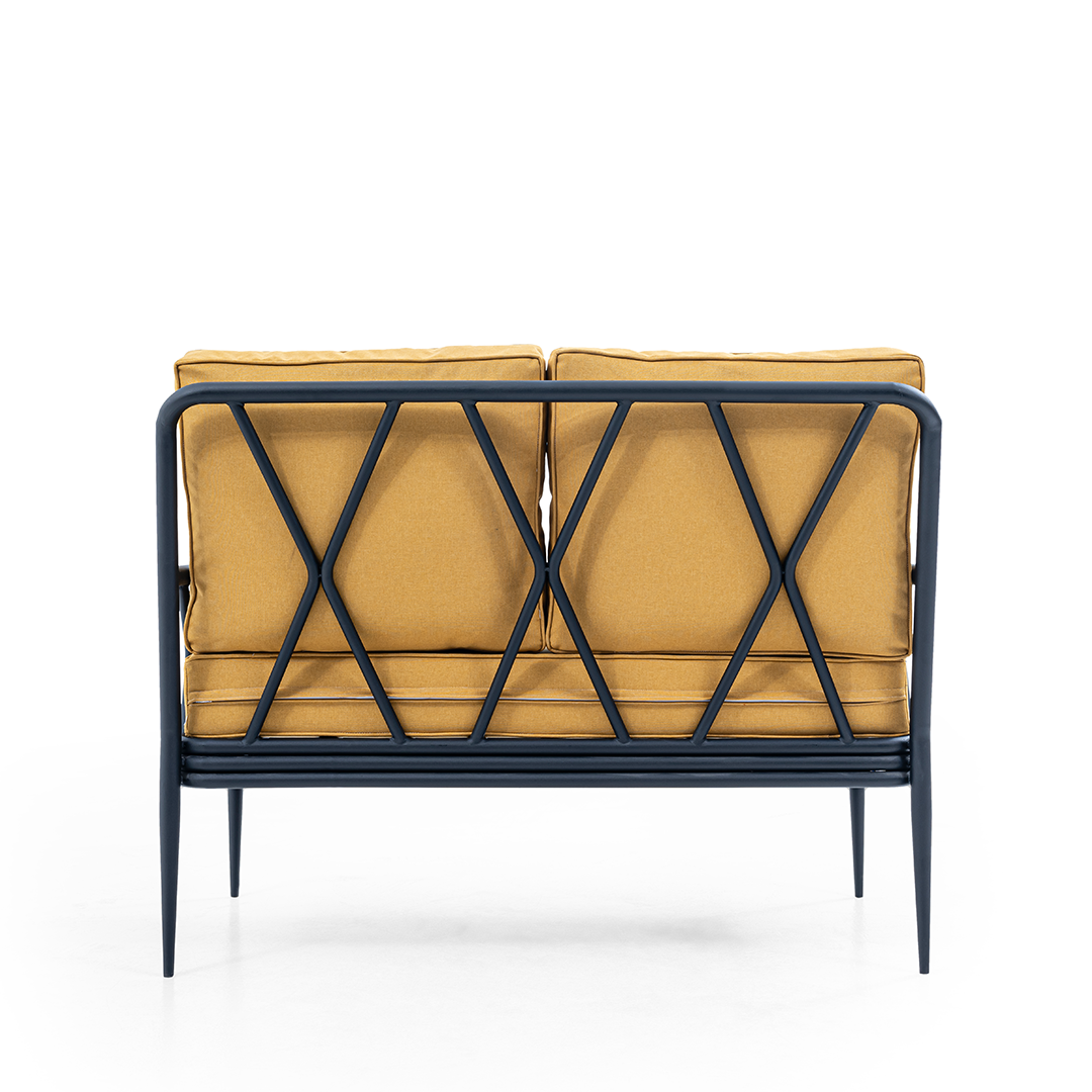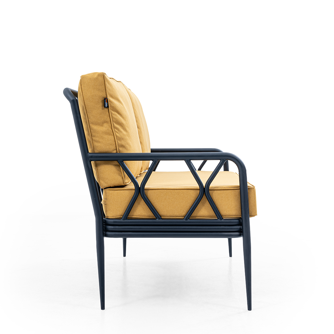 Greta Sofa is a modern sofa with treated outdoor stain-resistant and waterproof cushions sitting on a metal base. Combine with our Mythra Coffee Table to complete the look!