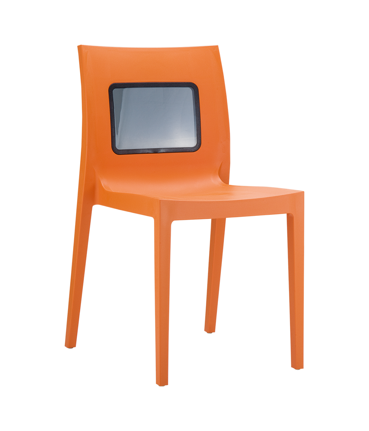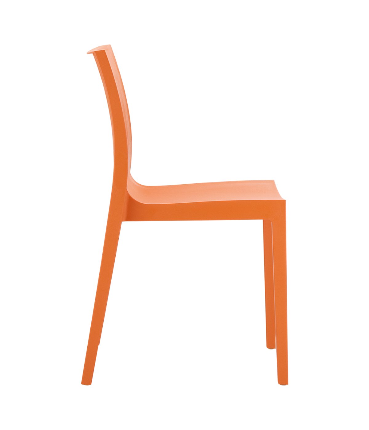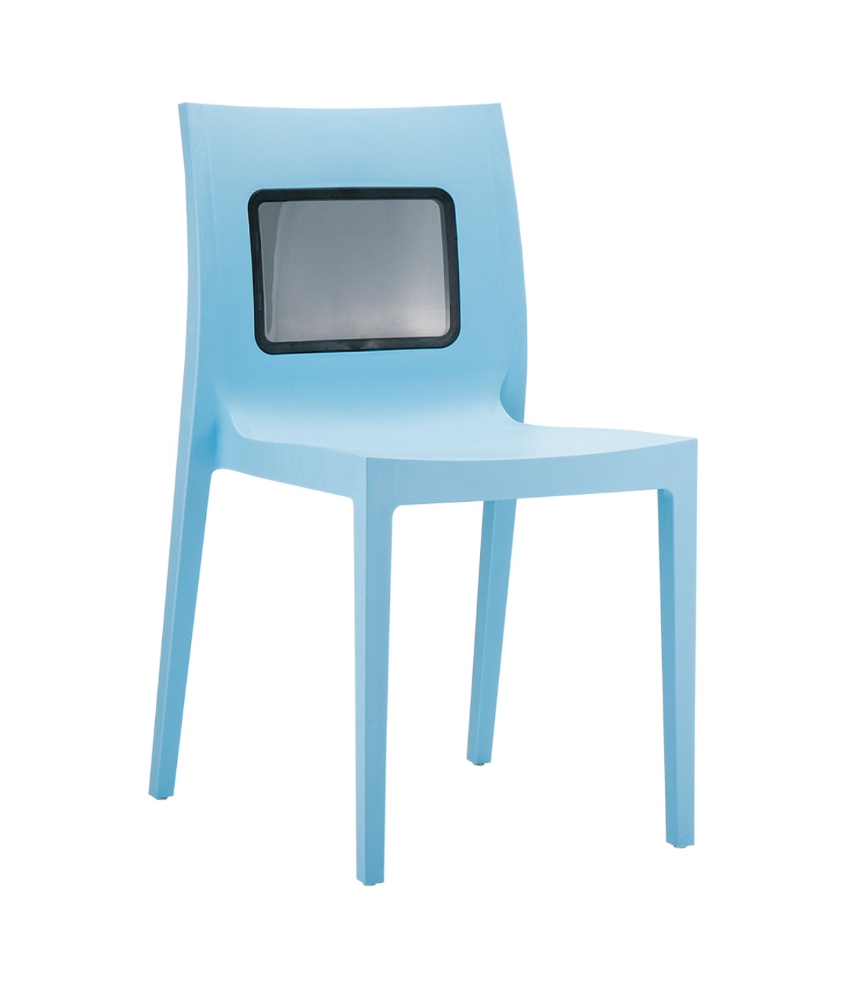 Stacking chair with the latest generation of air moulding thermoplastic injection. Back in transparent polycarbonate. For indoor and outdoor use.