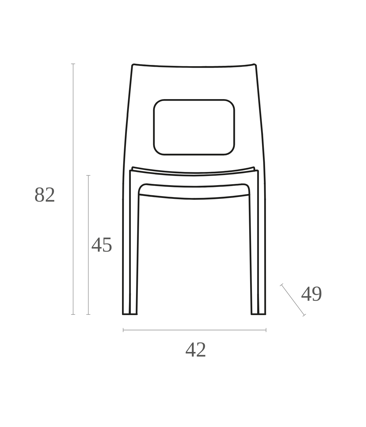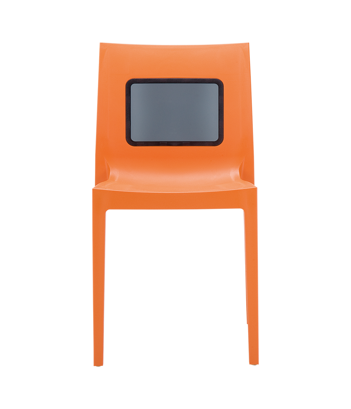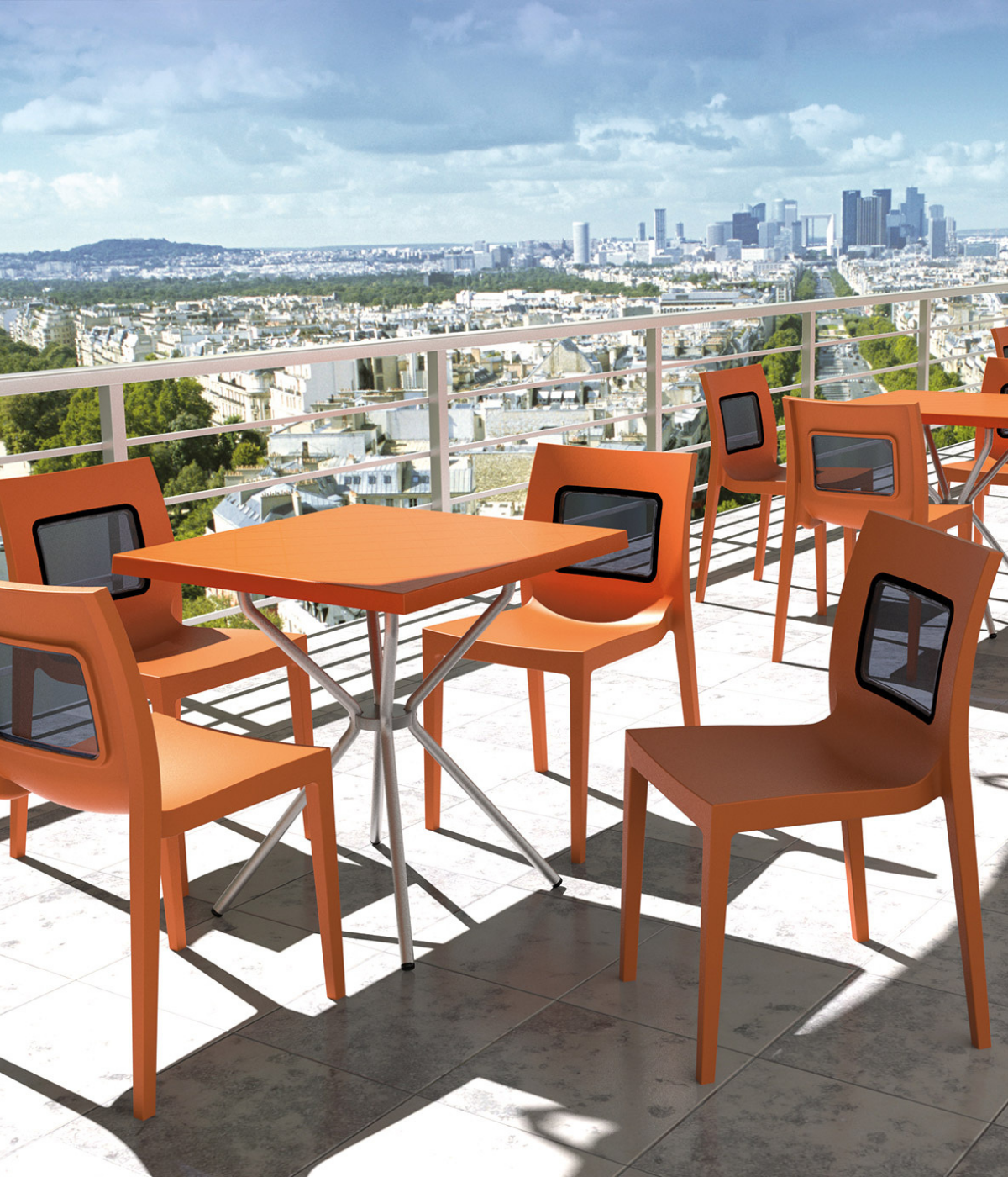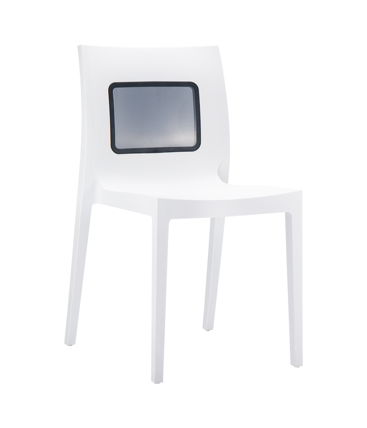 Stacking chair with the latest generation of air moulding thermoplastic injection. Back in transparent polycarbonate. For indoor and outdoor use.