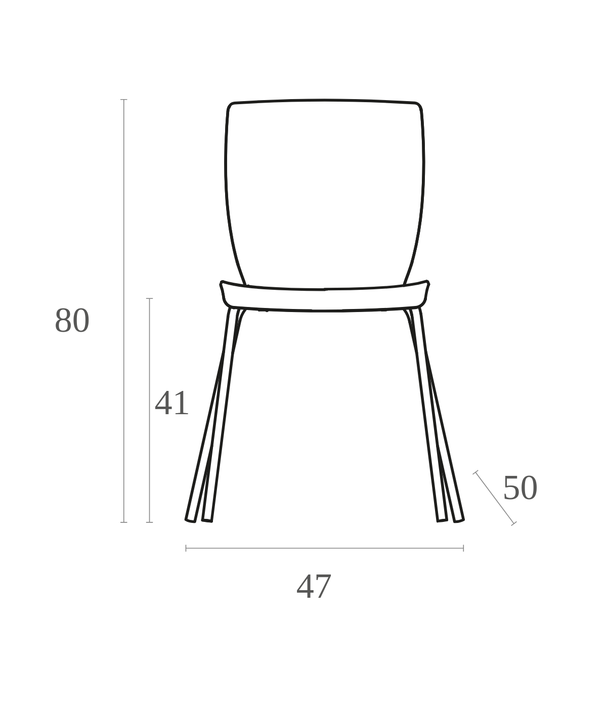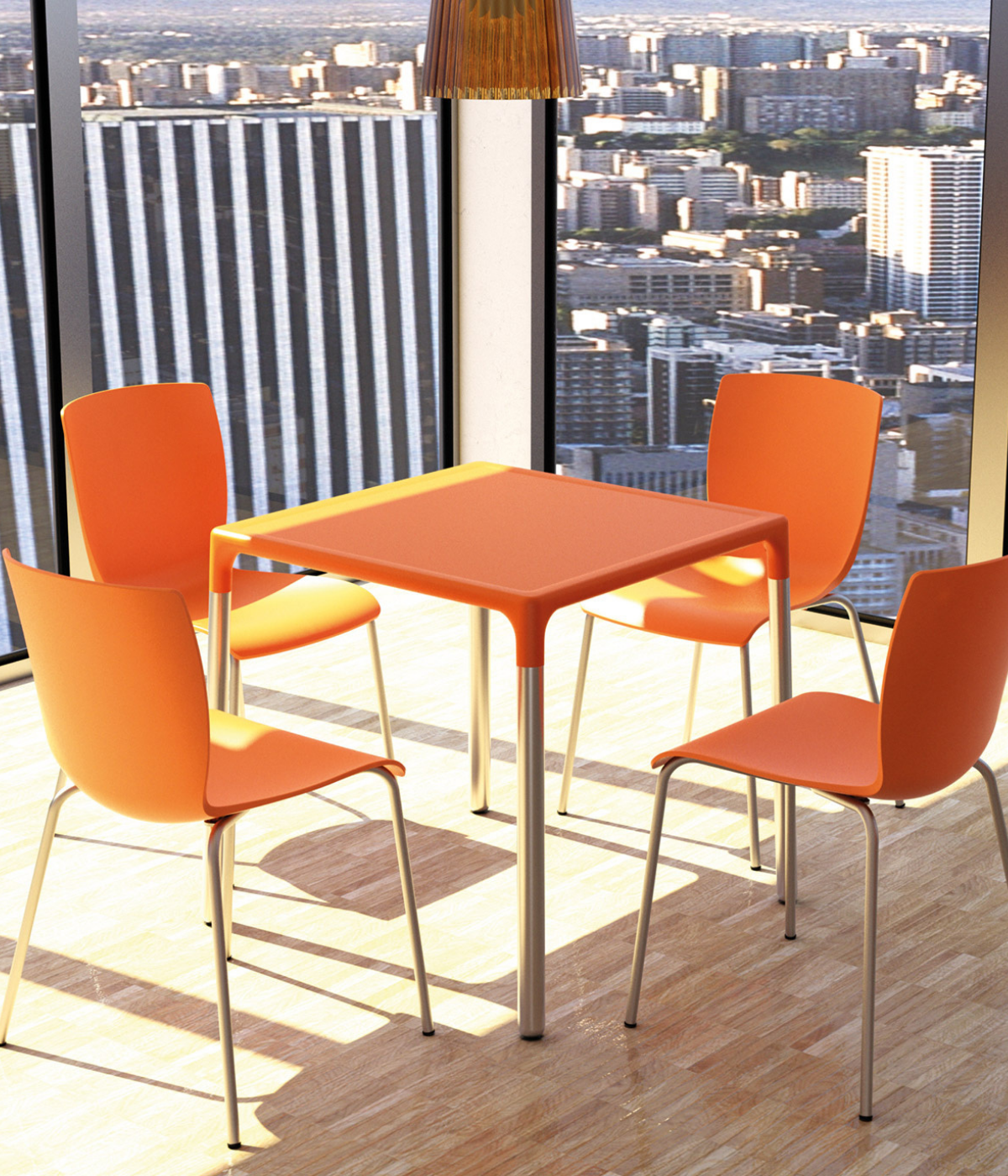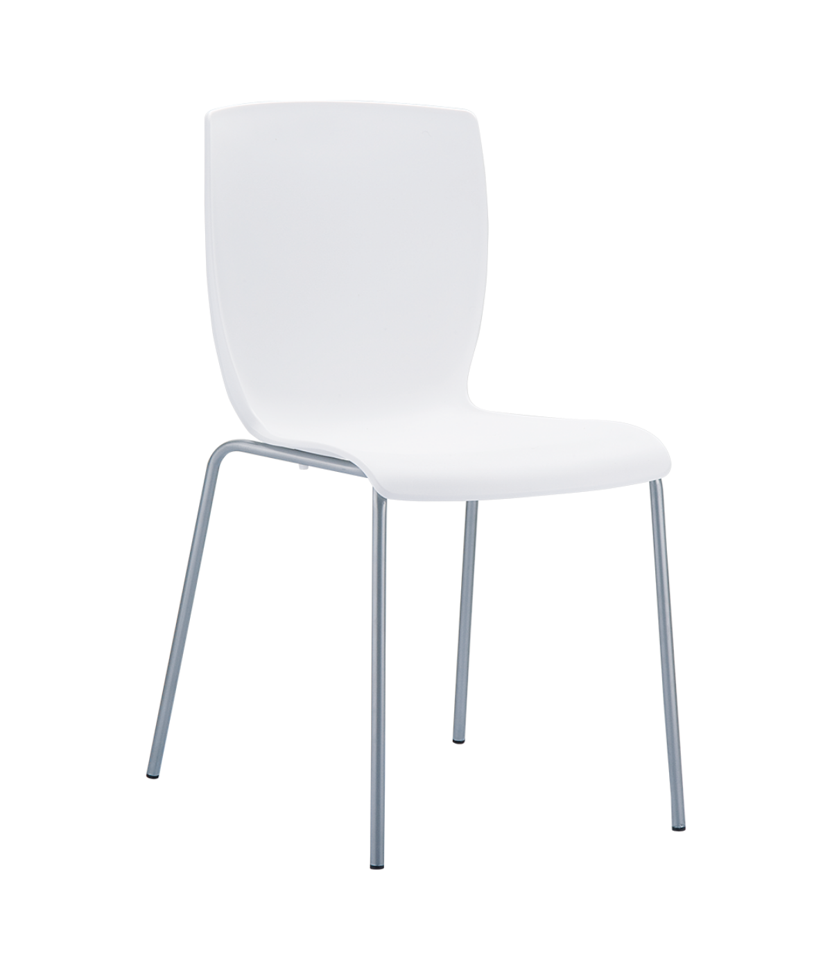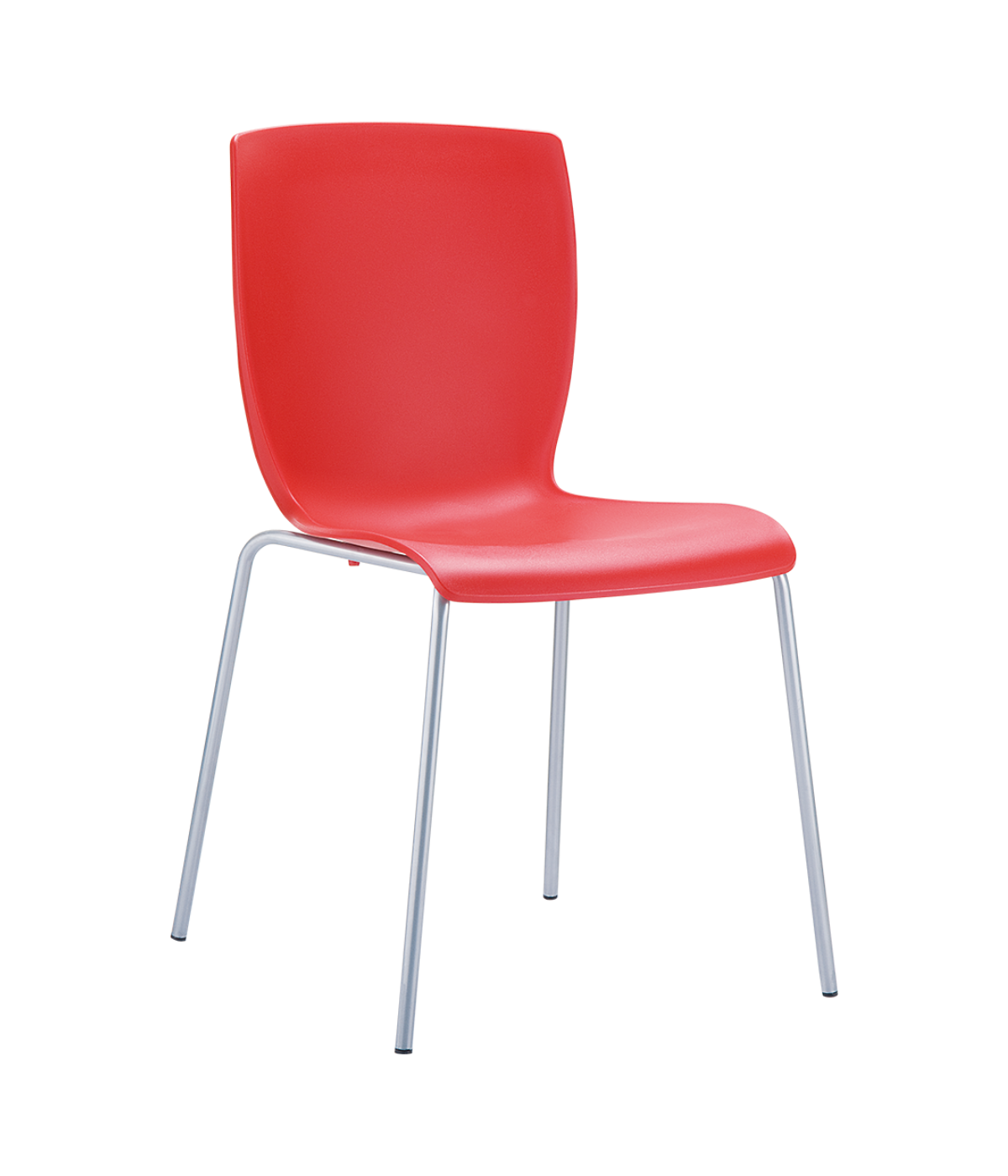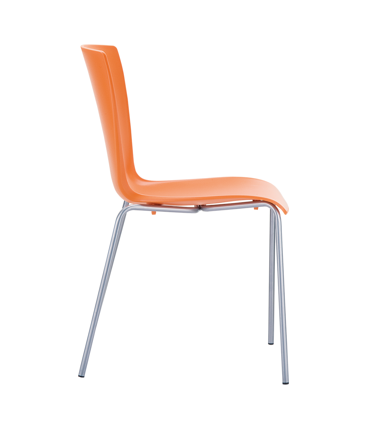 Stacking chair with recyclable polypropylene seat and backrest and painted steel legs. For indoor use.