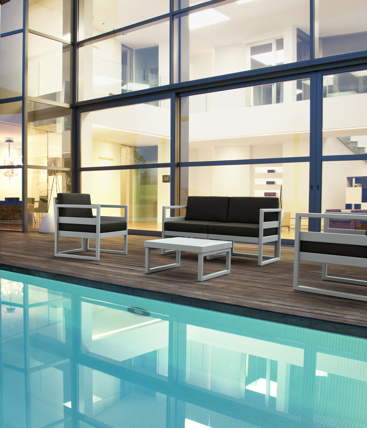 Mykonos Lounge Set is designed for easy self assembly, it is made of durable weather-resistant resin reinforced with glass fiber. Non-metallic frame will never unravel, rust or decay. It is UV protected which insures the colors will not fade. Can be disassembled. For indoor and outdoor contract use.