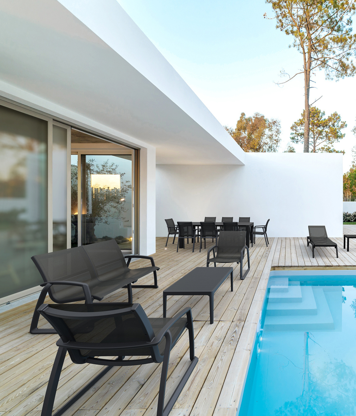 Pacific Lounge Set with arms is designed for easy self assembly, it is made of durable weather-resistant resin reinforced with glass fiber with Batyline fabric from Serge Ferrari. Non-metallic frame will never unravel, rust or decay. It is UV protected which insures the colors will not fade. For indoor and outdoor use. Can be purchased as set or separately.