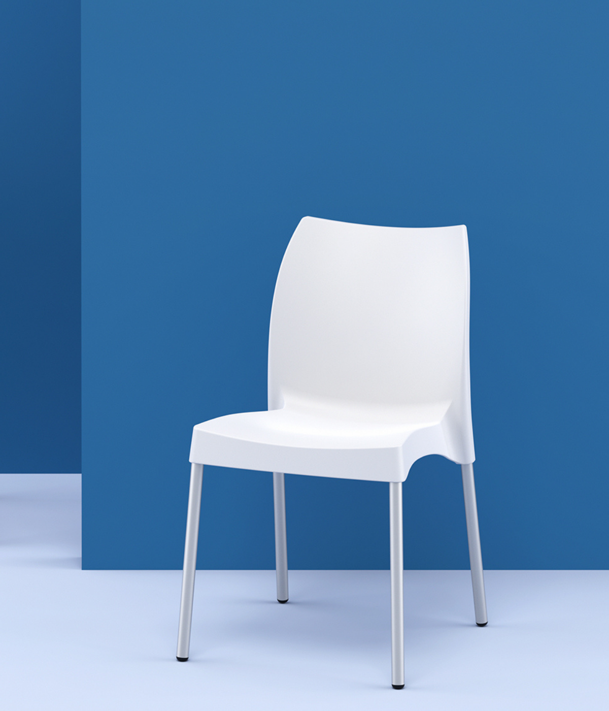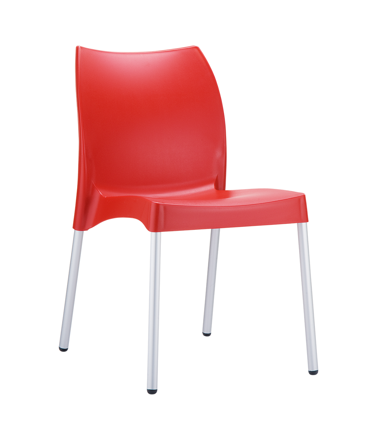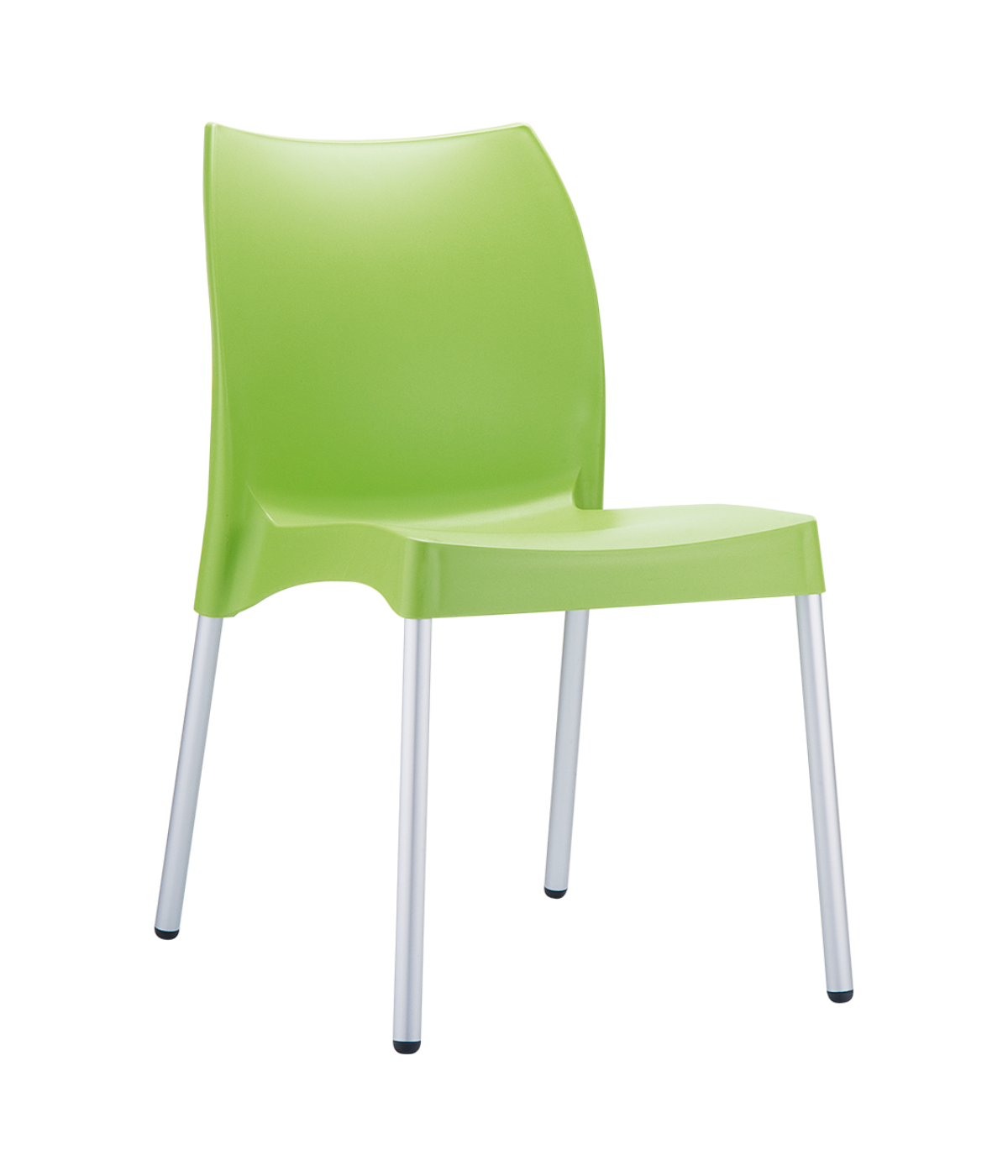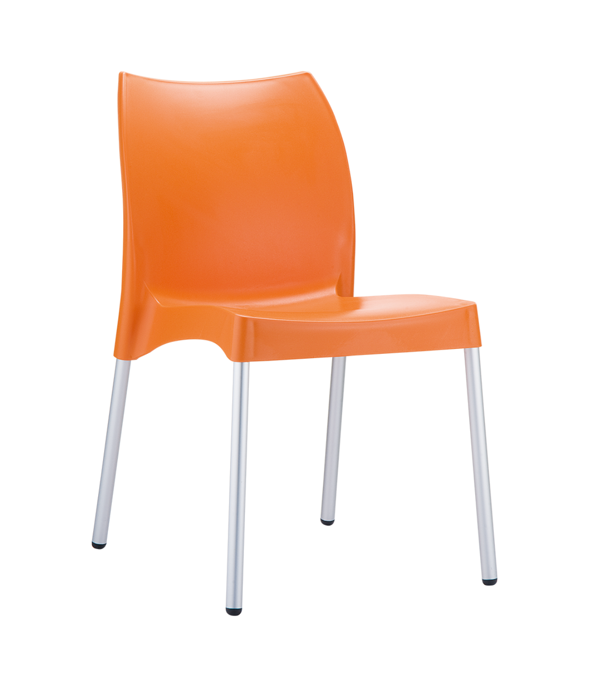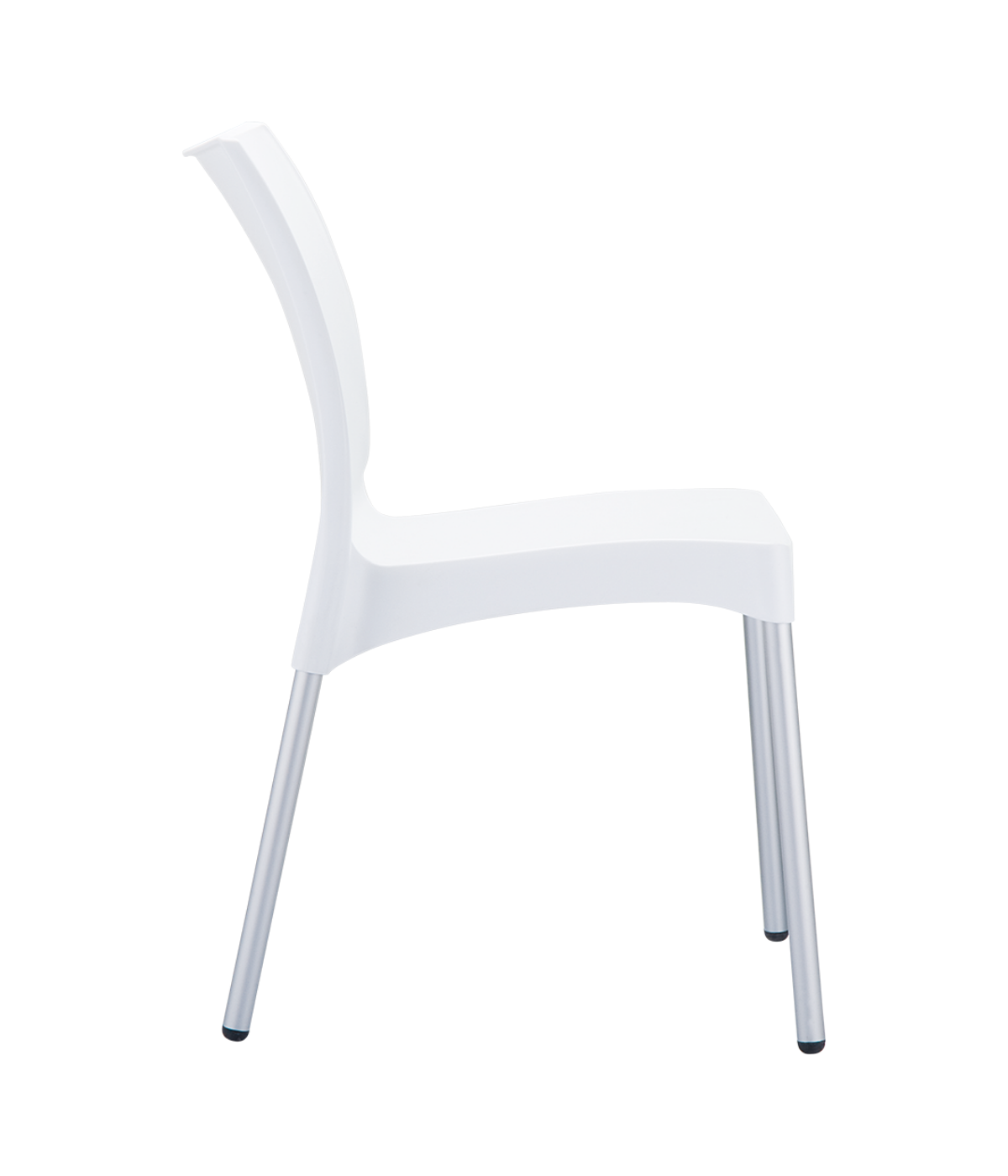 Stacking chair with recyclable polypropylene seat and backrest and anodized aluminium legs. Diameter 25 mm. For indoor and outdoor use.